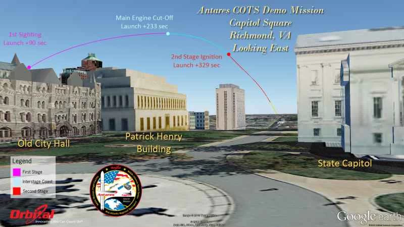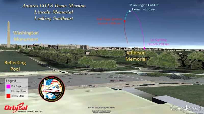 ここでは、アナポリス、米国議会議事堂、リンカーン記念館、国立航空宇宙博物館、ニュージャージー州アトランティックシティ、ニューヨーク市など、さまざまな人気の観光地の地上または高層ビルに立った視点から、アンタレスの軌道と両段階の発射時に見えるものを示す一連のグラフィックを紹介します。