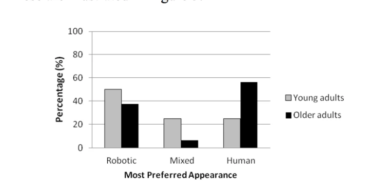 この研究には、18歳から23歳の大学生32人と、65歳から75歳の成人32人が参加した。研究者らはアンケートを通じて、研究のさまざまな時点での参加者のロボット全般に関する意見(「ロボットを使用すると日常生活が楽になる」)、ロボットの外見のあり方(「ロボットに目が欲しい」)、ロボットに対する慣れ親しんだ度合いについて質問した。最初に、参加者は意見アンケートを受けた。その後、家庭用ロボットの候補をいくつか見せられ、お気に入りを選ぶように求められた。選択肢は、非常にロボットっぽいロボット、より人間っぽいロボット(人間とロボットロボットの組み合わせ)、非常に人間っぽいロボット(実際には人間の写真だけ)に絞り込まれた。最後に、参加者は3つの中からお気に入りを選ぶように求められた。