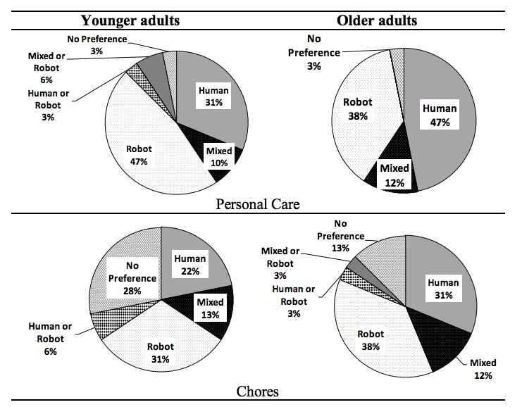 つまり、全体的に見て、年配グループは人間型ロボットを好み、年配グループはロボット型ロボットを好みました(そして、年配グループの方が選択はより均等に分散していました)。しかし、研究者がこれらのロボットにどのような具体的な作業をさせるか尋ねたところ、どうなるでしょうか?すると、状況は少し複雑になります。これらの質問への回答から作成されたグラフが以下です。