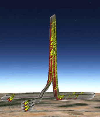 彼の目標は、宇宙船のための空域をコンパクトに切り開くことだ。その空域は、打ち上げ、再突入、そしてあらゆる緊急事態に安全に対処できるほど広大でありながら、飛行機への影響が最小限に抑えられるよう小さい。彼は、このようにしてできた空間を「4次元コンパクト エンベロープ」と呼んでいる。打ち上げ中ずっと3次元の空間を考慮に入れているからだ。緑色の幾何学的形状は、飛行機がロケットやその残骸に衝突するリスクが許容範囲を超える空域の部分を表している(FAAはこのリスク閾値をまだ決めていないが、アロンソ氏は仮説として100万分の1を挙げており、モデルを微調整することでリスクを増減できる)。そして、この写真は静的だが、4次元コンパクト エンベロープは動的だ。ロケットが軌道に沿って進むにつれ、飛行の初期段階では除外されていた空域が再び飛行機用に解放される。