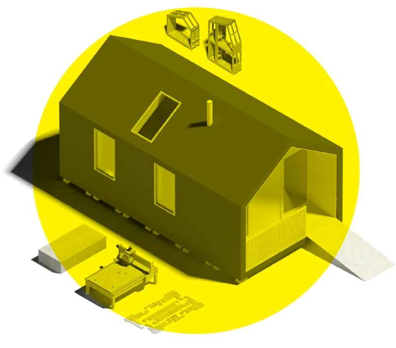 組み立て済みの家具と同様に、図面とカットされたパーツが明確に一致しているので、組み立ては簡単です。さらに、多くのパーツは合板から切り出されたくさびやペグで組み立てられるため、工具が簡素化され、必要な金属製の留め具の数も削減(場合によってはゼロに)できます。完成したフレームを外壁材で覆い、断熱材を詰めれば、居住空間が完成します。