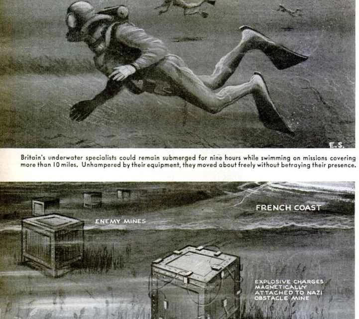 大きな「今こそ語れる」というスタンプが押された「フロッグ・メン」の物語は、戦争終結によって重要性が薄れた戦時中の秘密を描いています。この物語は、水中の機雷に磁化爆薬を取り付け、侵攻艦船を破壊する前に爆破させた専門ダイバーたちの物語です。記事より: