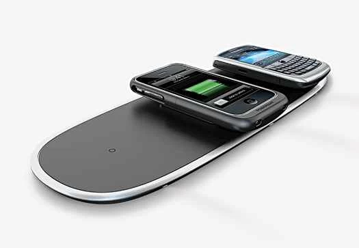 製品: Powermat(powermat.com)は、ユニバーサルワイヤレス充電器に最も近い製品です。上記のシステムと同様に磁気誘導方式を採用していますが、既存の低消費電力機器に受信機を接続することで充電できます。マット(本体はコンセントに差し込むタイプ)に最大3台の機器を置くと、無線IDチップが各機器を識別し、適切な電流を供給します。
