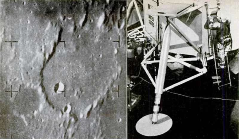 人類が月面に着陸できるのはあと5年後ですが、まだ夢はあります!左の写真は、レンジャー7号が初めて月の凹凸のある地形を詳細に捉えたものです。右の写真は、訓練中の宇宙飛行士が宇宙船の模型に乗っているところです。