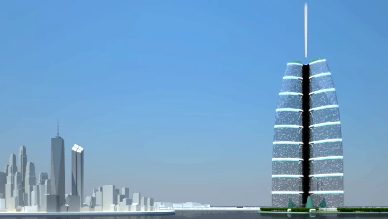 「この黒い空間が風力発電機なんです」とバス氏は言う。「建物は星型で、風を中央に集めてエネルギーを生み出します。そして、そのエネルギーは建物が消費できる量を超えているので、背後の街に電力を供給しているんです」。バス氏は、マルチエレベーターのおかげで建物を十分な高さにすることができ、風力発電の設計が可能になったと指摘する。