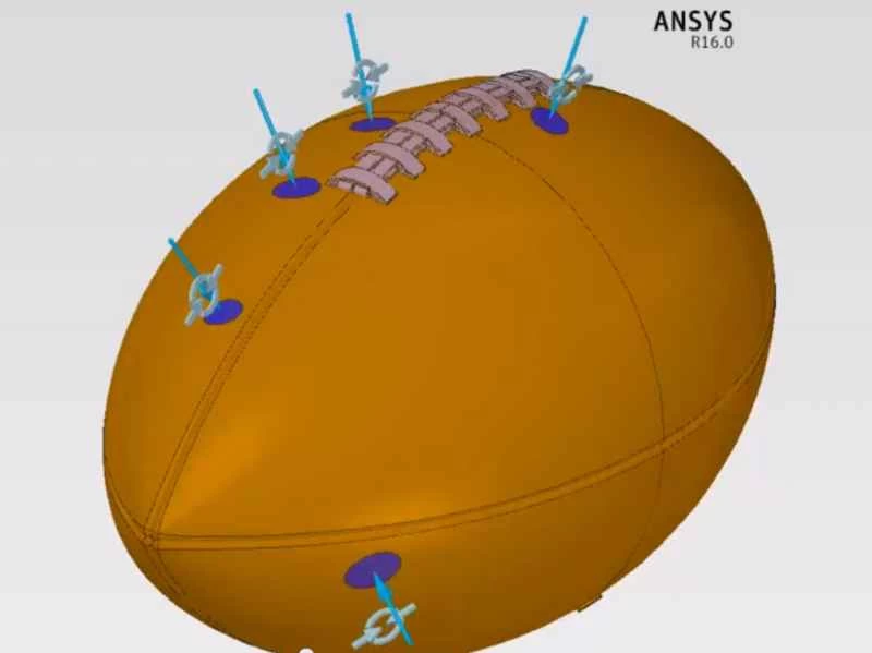 ANSYSは、流体力、熱効果、構造健全性などを組み込んだマルチフィジックスモデルを使用しました。このシミュレーションでは、フットボールの内外の温度、気圧、ボールの皮革やゴムの挙動などのデータを入力しました。そして、このシミュレーションを用いて、12.5psiのフットボールと10.5psiのフットボールの性能を比較しました。