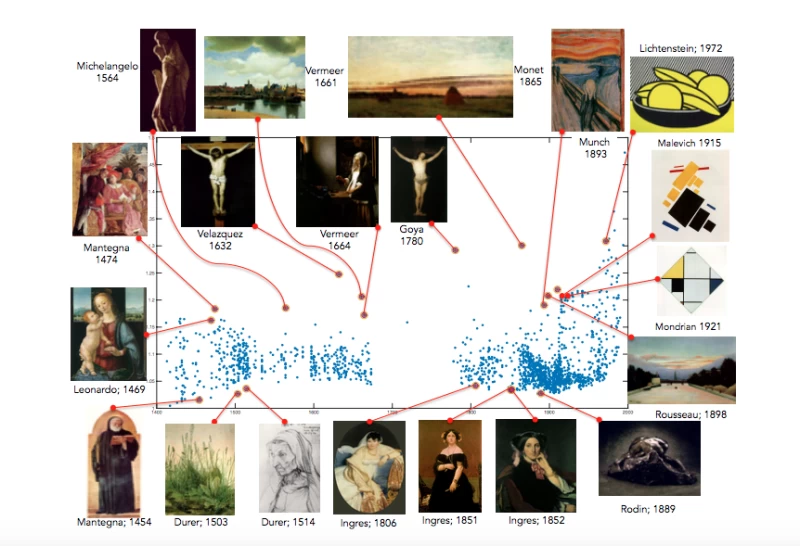 研究著者らは創造性を「作品の独創性と影響力」と定義しています。しかし、創造的な芸術は他の芸術作品との関連においてのみ存在するため、研究者たちは、形状の自然さ、描かれている情景、色の鮮やかさ、模様の複雑さといった視覚的要素に基づいて、絵画を時系列で比較する必要がありました。