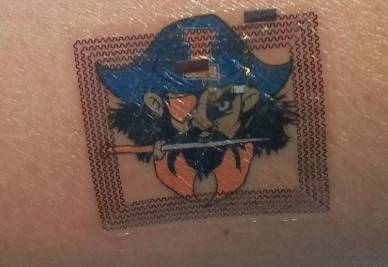 ジョン・ロジャースの前腕には、25セント硬貨ほどの大きさのパッチが貼られている。まるで、小さな砂ドルのように見える子供のタトゥーを彷彿とさせる。しかし、イリノイ大学アーバナ・シャンペーン校のエンジニアであるロジャースが実際に身につけているのは、「パスワードや医療IDなど、約100キロバイトのデータを無線で送受信・保存できる」電子機器だと彼は言う。