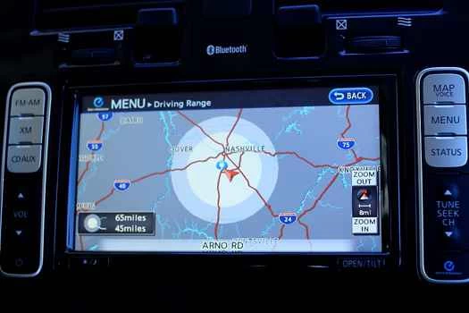 ユーザーインターフェース:計器類とコントロールパネルは、どれもハイテク仕様です。シャープなデザインのデジタルメーターパネルは、通常の機能(スピードメーター、オドメーター)に加え、残りの走行距離やエネルギー消費量のフィードバックも提供します。ただし、運転効率を測る最も簡単な方法は、残りの走行距離がどれだけ早く減るかを見ることです。(ちなみに、高速道路でこの車を急加速させると、その数値は急激に減少します。)あるモードでは、明るく見やすいナビゲーション画面に、充電切れになることなく運転できる半径が表示されます。充電と車内空調は、リーフのスマートフォンアプリから遠隔操作できます。そしてもちろん、Bluetooth、音声コマンド、クルーズコントロール、オプションのバックアップカメラなど、ミドルグレードの自動車によくあるガジェットも完備しています。