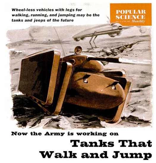 生物学に着想を得たコンセプトの中には、まだ発明されていないものもあります。1960年代、アメリカ陸軍は数人の大学教授に動物の運動能力に関する研究を委託し、同じ能力を戦車に応用することを目指しました。馬のように疾走したり、バッタのように跳躍したりする戦車。まるで怪物のように聞こえませんか?しかし、もしそれが実現できたら、生活はどれほど変わるか想像してみてください。