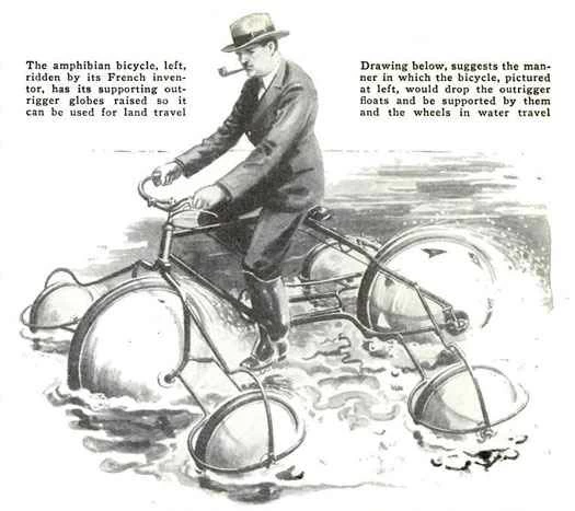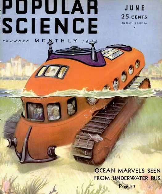 おまけに、1930年代のちょっと変わった水上飛行機もいくつか載せました。「明日の空の覇者」というタイトルのイラストに、誰が抵抗できるでしょうか? これらのコンセプトは、今にして思えばちょっと突飛に思えるかもしれませんが(水陸両用自転車を見れば一目瞭然です)、現在運用されている水陸両用車とそれほど変わりません。例えば、あるフランス人発明家は、ダックツアーで使われているものと似た水中ツアーバスを設計しました。ただし、彼のバスは実際に水中に潜ることができました。