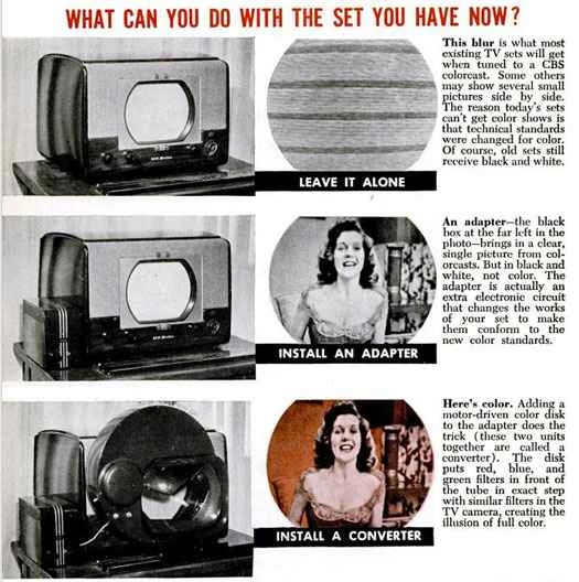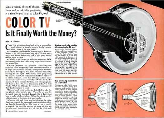 システムの技術的な難しさにもかかわらず、カラーテレビが未来であり、その可能性を称賛しないのは失礼だと認識していました。しかし、技術が成熟する前にカラーテレビの購入を良心に従って推奨できるでしょうか? 1950年代のカラーテレビは高価でした。1954年、ウェスティングハウス社は1300ドル弱のカラーテレビを発表しました。その約8年後、RCA社は500ドルのカラーテレビを製造しました。特に既に白黒テレビを購入していた人にとっては、これはかなりの出費に思えました。しかし、カラーテレビを購入できるかどうかに関わらず、読者は、カラーテレビが従来のテレビに取って代わった後、その技術に何が期待できるのかを知る必要がありました。
