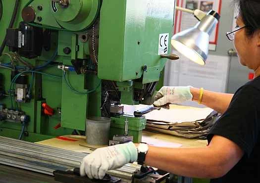 原材料は、ナイフほどの厚さの鋼板が巻かれた巨大なスプールに巻き付けられて工場に運ばれます。鋼板は個々のナイフとなる素材へと切り出されます。スプールから素材が取り出されてから、反対側の端にある完成したナイフが出てくるまで、約3週間かかります。