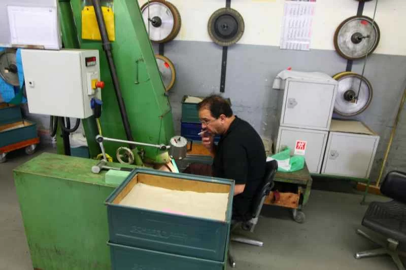 ナイフは別の一連のロボットの手に渡り、研削ホイールを使って厚めの素材を刃の先細りの輪郭に削り落とす。ただし、これはあくまでも大まかな作業で、細かい研磨や研ぎ、そしてハンドルの取り付けは工場の作業員に任される。作業員たちはふわふわのグレーのオーバーオールを着て、仕事が非常に上手で、何世代にもわたるナイフ職人の家系出身であることからくる自信を漂わせている。木製のハンドルはナイフの柄に接着され、リベットで固定される。プラスチック製のハンドルは、柄を加熱して既存のハンドルに差し込むだけで簡単に取り付けられる。ハンドルのエッジはロボットによって滑らかに仕上げられる。