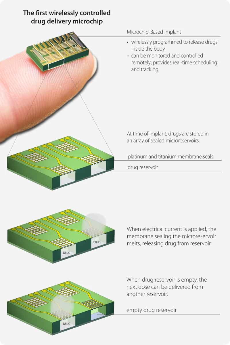 将来的には、体内に埋め込まれたコンピュータ化された薬剤投与システムが、薬局や診療所への通院に取って代わり、体内に埋め込まれた医療機器から自動的に薬剤を血液中に注入するようになるだろう。これらの小型無線チップは、痛みや不便さを軽減し、患者が必要な量の薬剤をボタン一つで正確に投与できるようにすると期待されている。