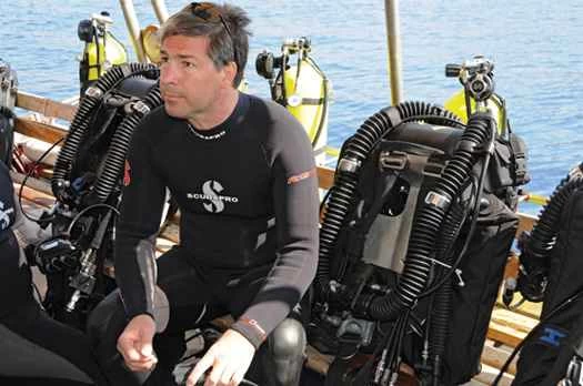 数分間、船をぐるぐる回し続けた後、フォーリーは行動を起こした。朝早く、ジョルゴスがこの辺りでダイビングをするのがとても楽しみだと話していたので、フォーリーはいつもの同僚ぶりで、ちょうどいいタイミングだと提案し、「運転してもいいかな?」と付け加えた。舵を取り、フォーリーはエンジンをアイドリングまで落とした。ボートは減速し、ディアの黄色い崖に向かって南へ向かう穏やかなうねりの上を漂っていた。気温は約27度(摂氏約30度)、水中の視界は約30メートル。少なくとも何とかコントロールできるようになったフォーリーは、安心した様子で、むしろ嬉しそうだった。