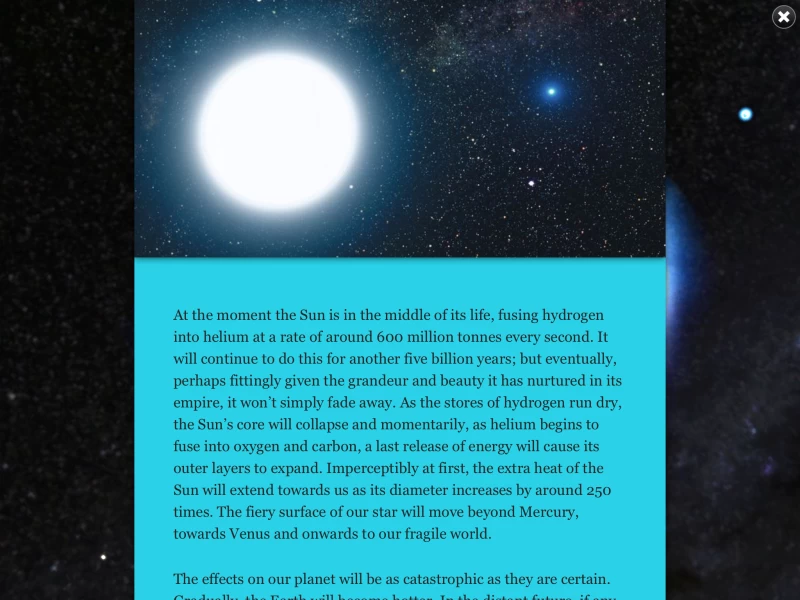 画面下部の水平スクロールバーには、現在いる宇宙の部分に関連するトピックが表示されます。宇宙を自由にズームしたりスクロールしたりするのは楽しいですが、このアプリでは、特定のトピックについて特定の順序で学習するように誘導されます。これは最初からより明確にする必要があります。なぜなら、誰もが最初にズームしてスワイプし、個々のラベル(「アンドロメダ銀河」、「かに星雲」など)をタップすることになるためです。すべての「章」はつながっているため(「亜原子」は「原子」に当てはまり、「原子」は「太陽系」に当てはまり、「太陽系」は「星」に当てはまり、「天の川」に当てはまる、など)、背景をピンチすることで章間をズームできます。「太陽系」を見ながら十分にズームアウトすると、下のバーに星に関する記事やビデオが表示され始めます。特定のトピックに関する記事を読むには、画面下部のバーから記事を上に引っ張り上げ、次に進む準備ができたら閉じます。