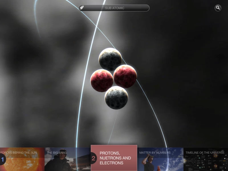 今朝リリースされ、期間限定で6.99ドルで販売されている「Wonders」は、驚異的な作品です。画面の大部分はズーム可能な3D宇宙で占められており、ベルベットのような黒い背景に輝く点々が動き回ります。画面上部にはナビゲーションバーがあり、「素粒子」「原子」「太陽系」「恒星」「天の川」「銀河」「宇宙」といったセクションに移動できます。これらをタップすると、章の冒頭までズームインできます。