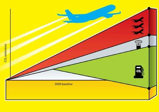 2050年までにネットゼロ排出?:中国、インド、ペルシャ湾地域での航空便の増加に伴い、二酸化炭素排出量は既に深刻な水準にある2009年をはるかに上回る勢いで増加するでしょう。旧式で重量のある航空機を新型機に更新し(赤色のバー)、航路やその他の航空交通管理手順を改善すれば(灰色のバー)、2050年までに排出量の増加率を半減させることが可能です。しかし、二酸化炭素を吸収する藻類から作られる航空バイオ燃料(緑色のバー)の使用は、増加率の抑制以上の効果をもたらす可能性があります。生産システムが導入されれば(そして実際に機能すれば)、ネット二酸化炭素排出量を2009年よりも低い水準まで削減できる可能性があります。
