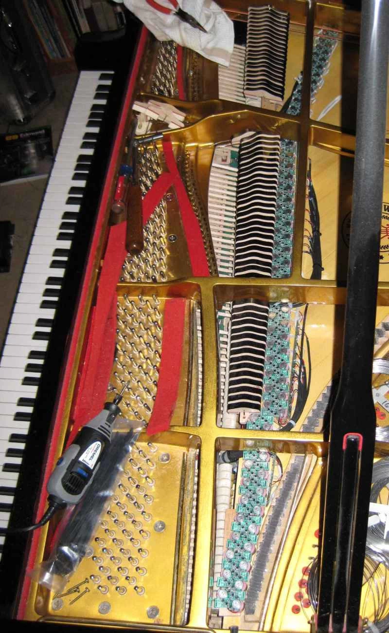 システムは、演奏者が右下、鍵盤の真下にある「オン」ボタンを押すと起動します。次に、個々の回路基板が磁気コイルを作動させ、ピアノのすべての弦から同時に音を出します。赤外線センサーが各弦の周波数、つまり振動速度を測定し、コンピューターがその周波数を、プロの(そして人間の)ピアノ技術者が調律した後に録音した音と比較します。元の調律がずれていると思われる場合(例えば、部屋の大きさや温度がピアノの音色に影響を与えることがあります)、所有者はピアノを再調律し、その設定をコンピューターに保存することができます。