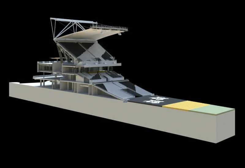 「屋根のカバーと、そこで必要な工事については、多くの議論を重ねました。」しかし、ここ数十年のスタジアム建設で見られるように、コンクリート製のボウルの上に巨大な天蓋を載せてトラックを完全に囲み、風雨から守るといった単純なものではありませんでした。モジュール構造のため、座席やアメニティを囲み、風から内部を守るために一般的に用いられるファサードさえ構築できず、ましてや競技面を保護する巨大な屋根を設置することなど不可能でした。