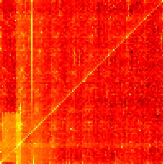 340万個のPINのデータセットが使用されました。最初の2桁は横方向に、次の2桁は縦方向に表示されています。そこに走る黄色の斜めの線は、1111、2222などの数字の出現頻度を示しています。データ・ジェネティクスは、このグラフに使用されている数字(「公開/暴露/発見されたパスワード表とセキュリティ侵害」に基づく)を分析した結果、興味深い発見を導き出しました。