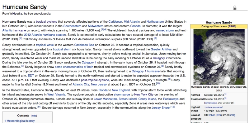 サンディのWikipedia記事は、10月23日遅くにユーザーAnonymouse321によって作成されました。当時、サンディはカリブ海上空の熱帯暴風雨で、NASAのテラ衛星が捉え、ジャマイカ政府がハリケーン警報を発令していましたが、誰も注意を払っていませんでした。このページは当初「熱帯暴風雨サンディ」と呼ばれていました。10月25日には、嵐は速度を増し、より危険になりそうだったので、ケンは注目しました。ケンはフロリダ中央部の海岸、デイトナビーチの北の大西洋側に住んでいますが、彼の出身はクイーンズの少し東にあるロングアイランドの町、ヘムステッドです。嵐はカリブ海を通過して東海岸を北上し、ケンが現在住んでいる場所を越えて彼の故郷にまで到達するかのようでした。ケンは興味を持ちました。