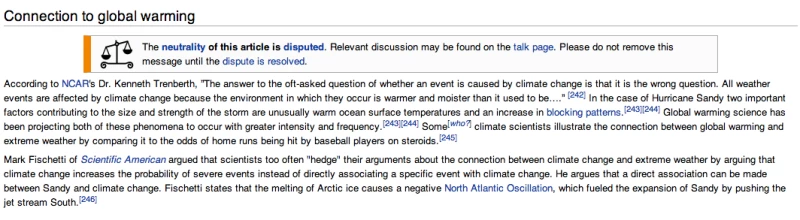 11月1日の夜遅く、Wikipediaページの下部に「地球温暖化との関連性」という新しいセクションが現れました。これは記事で初めて気候変動に言及したもので、気候科学者の反応が示されていました。主に、気候科学者はハリケーンが気候変動によって部分的に発生したのか、それとも全体的に発生したのか、はっきりと分かっていないと述べていました。WikipediaでKennvidoという名前で活動しているケンにメールを送ったところ、彼はこう返信してきました。「ありがとう。また削除しました。そして、サンディについては地球温暖化のページで議論するように伝えました。」ページをリロードして確認すると、ケンが気候変動に関する議論をすべて削除していたことが分かりました。数分後、リロードするとセクションは復活していましたが、「この記事の中立性には疑問があります」という大きなブロック警告が表示されていました。 10時23分までに、その警告は次のようになっていました。「編集者から、このセクションが記事の主題全体に関連する特定の考え、事件、論争、または事柄に過度に重点を置いているという懸念が表明されました。よりバランスの取れた表現の作成にご協力ください。」