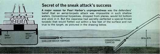 少なくとも当初はそうだった。1966年12月号の『ポピュラーサイエンス』特集「真珠湾攻撃の秘密兵器」では、日本の成功の要因として、浅海域攻撃型航空魚雷と艦隊の探知回避能力という2つの主要な要因(他にも要因はあった)が挙げられている。