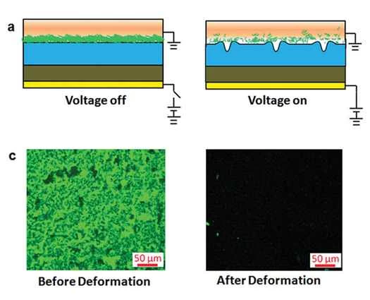 電気刺激や伸張圧力などの刺激に反応して、素材表面に微細な変化(小さなシワ)が生じ、蓄積した細菌を除去します。電気を止めると、素材は元の平坦な状態に戻ります。