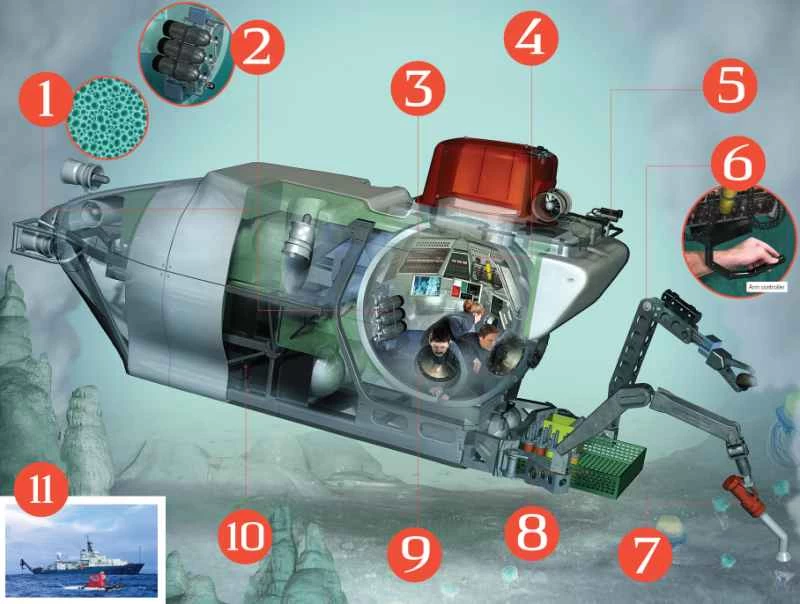 3) 直径7フィート(約2メートル)の人員球体は、パイロット1名と科学者2名(他の研究用潜水艦より科学者が1名多い)を収容可能で、従来より18%大きい。水深4マイル(約6.4キロメートル)で1平方インチあたり1万ポンド(約10,000ポンド)の圧力に耐えられるよう、製作者は球体表面の50万箇所において、水中で発生する圧力をモデル化した。