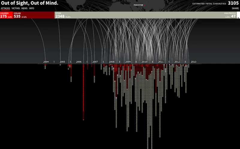 この視覚化は、わずか数件の重要標的を殺害するために行われた攻撃による巻き添え被害の規模の大きさを非常に巧みに伝えており、これらの重要標的に関する情報は、評判の高いニューアメリカ財団から提供されている。パキスタン上空における米国のドローン戦争を報道・分析する上で真の課題となるのは、情報源を正しく把握し、真実を操作しようとする様々な利害関係者から事実を切り離すことだと、ドローン戦争に関するパキスタンの公式説明に長年疑問を呈してきたジョージタウン大学のクリスティン・フェア教授は指摘する。