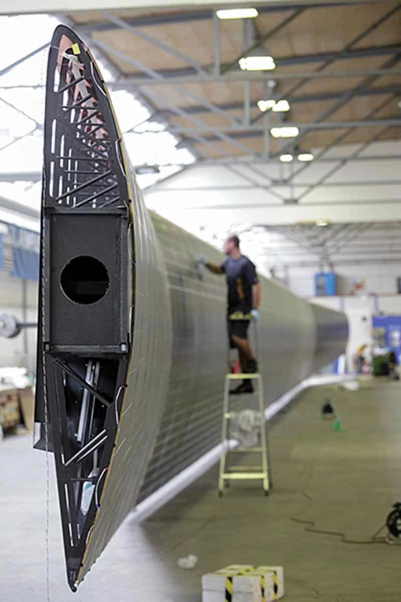 エンジニアたちは、カーボンファイバーシートを支柱と桁に重ねることで、この飛行機の超軽量骨組みを構築しました。軽量で剛性の高いフォームが翼端を形成し、ゴンドラとコックピットの断熱材として機能しています。