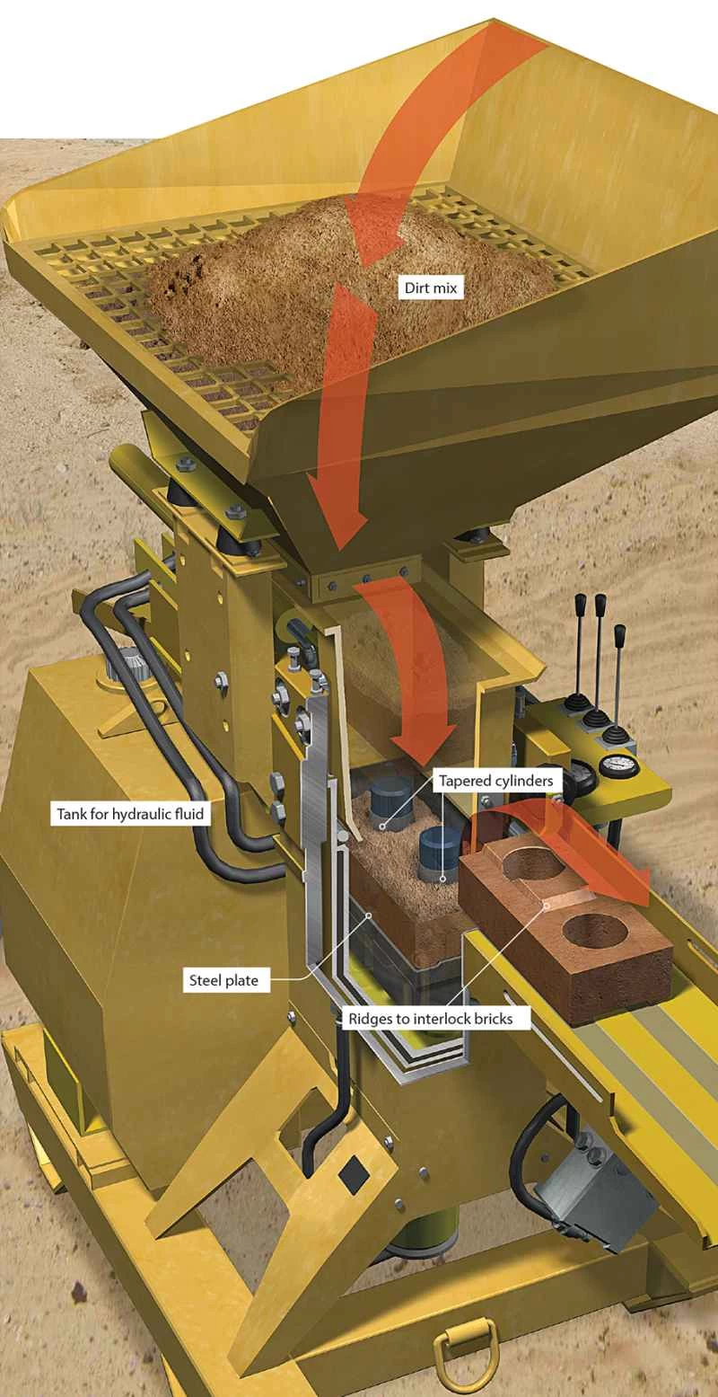 工程はシンプルです。作業員が土と少量の水、そしてセメントを混ぜ合わせ、シャベルでフェルメールに投入します。混合物の一部は、内蔵のディーゼルエンジンによって油圧で加圧されたチャンバーに入り、そこで鋼板が55,000ポンド(約2万4千トン)の圧力で土を圧縮し、ブロック状にします。レンガを強固で均一にするために、この機械は独自の仕組みを採用しています。2本のシリンダーがレンガの中に滑り込み、土をさらに圧縮するのです。