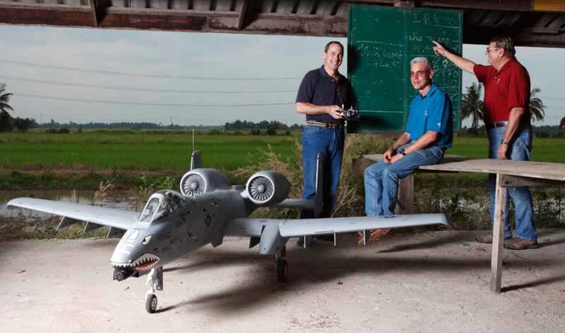 水浸しの水田は足元が柔らかく、踏み心地は悪くないかもしれないが、時速200マイル(約320キロ)で飛ぶ飛行機を着陸させるには、決して良い場所ではない。タイのバンコク近郊の荒れたアスファルト滑走路で、幅3メートル、重さ65ポンド(約30キログラム)の手作り模型A-10ウォートホッグが初離陸を開始するのを見守るマイク・セルビーの表情は、まさにそんな理由の一つに過ぎない。1万2000ドル以上を費やし、ほぼ1年かけてこのラジコンジェット機を製作・構築したセルビーは、滑走路脇に立ち、ジーンズのベルトループに親指を引っ掛け、キューバ産の葉巻を吸いながらリラックスした様子を装っている。しかし、足を踏み鳴らすのをやめられない。彼の隣では、エアフォースワンからU2偵察機まであらゆる航空機を操縦した経験を持つ、米空軍将軍でテストパイロットのレイ・ジョンズパイロットが、不安げにガムを噛みながら、首からぶら下げた操縦卓の重みに背を預けている。