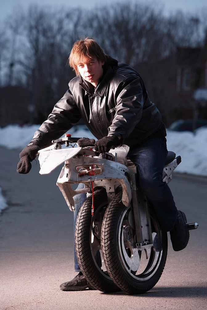 グラック氏は大学進学を1年間延期し(現在19歳、今秋MITに入学予定)、トロント郊外のバイクショップでUnoの製作に着手した。彼は、ほとんどのバイクよりも幅が広いヤマハR1のフレームを改造し、サイドバイサイドホイールを収納できるようにした。しかし、すぐに電子工学の知識が自分の手に負えないことに気づいた。Unoに数秒乗っただけで、回路が発火してしまうのだ。そこでグラック氏は、自動バランス調整ソフトウェアを専門とするロボット工学エンジニア、トレバー・ブラックウェル氏に連絡を取った。ブラックウェル氏の協力を得て、グラック氏はUnoにジャイロスコープと制御システムを搭載し、ライダーのタイヤ上でのバランスを保ちながらサスペンションを制御することに成功した。
