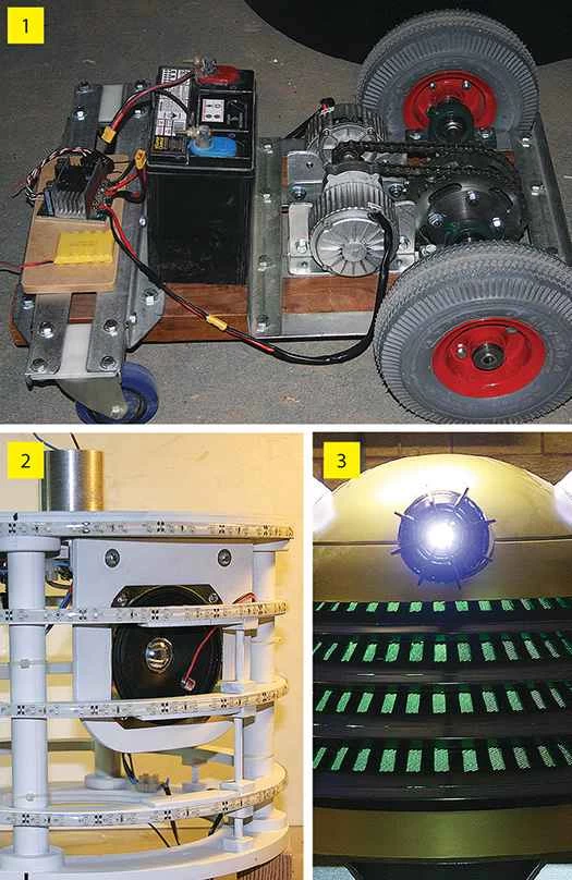 エイリアンの装甲胴体は、キャスターとスクーターの車輪が取り付けられた木製の台座の上に置かれています。オリジナルのダーレクは周囲の環境から電力を得ていましたが、ロシターのダーレクは標準的な12ボルトの自動車用バッテリーを使用しています。