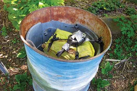 武器?翌日、地元のホビーショップで50ドルを出して、起爆装置と、模型ロケットの打ち上げに使う火薬入りのチューブ3本を買った。家からそう遠くない人里離れた公園で、岩の上に座り、チューブをダクトテープでドローンに固定した。ドローンが離陸すると、周囲に誰もいないことを二度確認してから、起爆装置を押した。