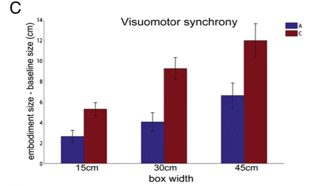 知覚をテストするため、被験者は仮想空間に没頭しながら、3つの異なる大きさの立方体の大きさを推定しました。どちらのグループも立方体の大きさを過大評価しましたが、子どもの体で自分自身を見ている場合、被験者はさらに大きく立方体の大きさを過大評価しました。彼らは、立方体を大人の視点から見ているときの約2倍の大きさに認識しました。