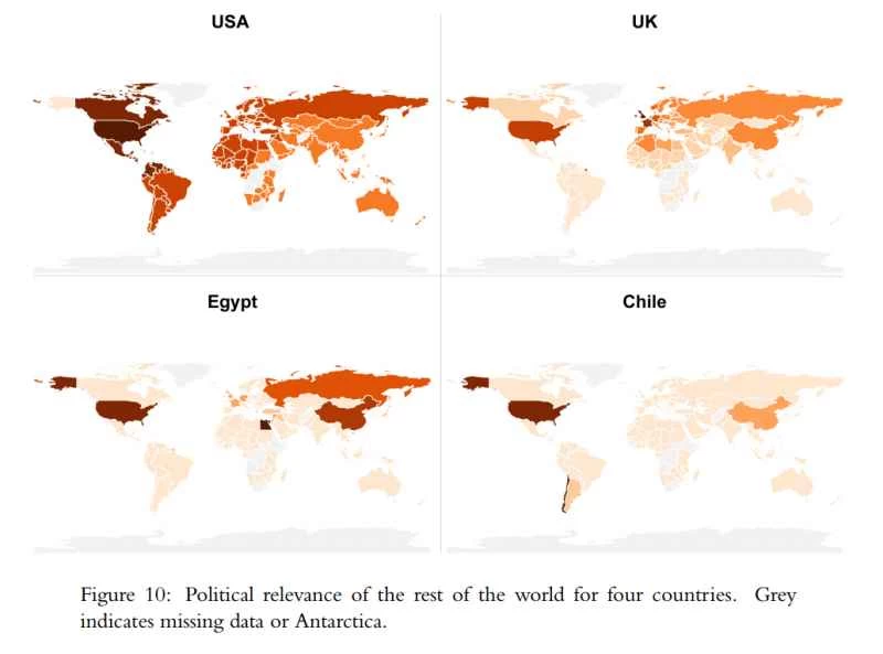 スペクトルのもう一方の端、つまり私が考案した指標は、統計的尺度を用いて、距離と最強国の能力に基づいて、政治的関連性の連続的なスペクトルを作成するものです。米国にとって政治的に非常に重要な国は数多くありますが、英国はより遠方の利益を追求する可能性のある地域的なプレーヤーであり、エジプトは非常に地域的なプレーヤーであり、チリは政治的に重要な国はほとんどありません。