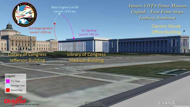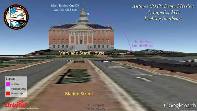 ここでは、アナポリス、米国議会議事堂、リンカーン記念館、国立航空宇宙博物館、ニュージャージー州アトランティックシティ、ニューヨーク市など、さまざまな人気の観光地の地上または高層ビルに立った視点から、アンタレスの軌道と両段階の発射時に見えるものを示す一連のグラフィックを紹介します。