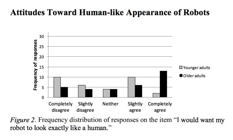 研究者たちは以下のことを発見しました。まず、年齢差に関係なく、ほとんどの人がロボットに対して肯定的な態度を示していましたが、若者の方がロボットの経験が豊富でした。両グループで大きく異なるのは、ロボットの外見に対する希望でした。年配の人々は概ね人間そっくりのロボットに賛成でしたが、学生はその考えに慎重な姿勢を示しました。「私は自分のロボットが人間そっくりであってほしい」という質問に対する回答は以下のとおりです。