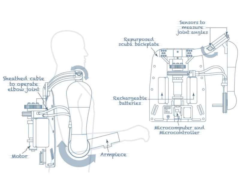 18ポンド(約8.7kg)のスーツはバックパックのように背負えます。再利用されたスキューバダイビングのバックプレートに電子機器とモーターが収納されています。アームストラップは、肩から手首まで伸びるアルミニウムと3Dプリントされたプラスチックのパーツに繋がっています。このデザインにより、持ち上げた重量が背中に分散され、正しい姿勢を保つことができます。
