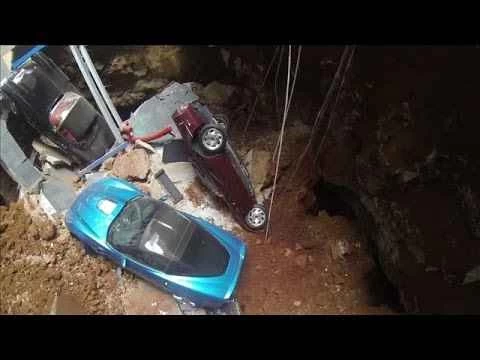 水曜日、ケンタッキー州の国立コルベット博物館で幅40フィート、深さ30フィートの陥没穴が開き、8台のコルベットが穴に落ちました。この穴を調査するため、ウェスタンケンタッキー大学の工学部は、人間ではなくドローンを投入するという賢明な判断を下しました。ウォール・ストリート・ジャーナルが入手したこの動画は、ドローンによる写真撮影の商用利用を禁じるFAAの規則を巧みに回避しています。動画では、ドローンのローターの音が聞こえ、2本の脚も確認できます。さらに、巨大で恐ろしい陥没穴と、一群の高級車も映っています。