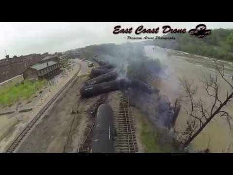 上:2014年4月30日、バージニア州リンチバーグで発生した列車脱線事故のドローン撮影映像。WSET.com – ABC13より。