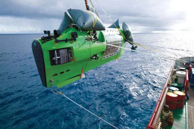 2012年3月下旬、グアム沖の西太平洋で、ライムグリーンの楕円形の潜水艇が水面を割った。近くの船、マーメイド・サファイア号のデッキでは、80人からなるサポートチームと撮影クルーが大歓声を上げた。チームは奇妙な姿をした潜水艇をウインチで引き上げ、ハッチを解放した。ドアが勢いよく開き、さらに大きな歓声の中、伝説のジェームズ・キャメロン監督が登場した。