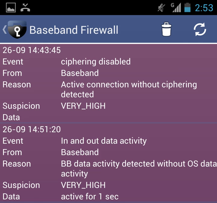 標準的なAppleやAndroidのスマートフォンでは何も問題が見られないにもかかわらず、Cryptophoneのベースバンドファイアウォールは、携帯電話の暗号化が無効になっていることと、基地局に名前が付いていないことを示すアラートを発しました。これは不正な基地局の明らかな兆候です。VerizonやT-Mobileなどが運営する標準的な基地局には名前が付いていますが、傍受型の基地局には名前がないことが多いのです。