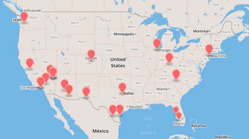 CryptoPhoneが、より安価な競合製品にはできないことを実現できることを示すため、彼は彼と顧客が作成した地図を見せてくれた。そこには、CryptoPhone 500が7月だけで全米各地で検知した「インターセプター」と呼ばれる偽の携帯電話基地局17基が示されている(下の地図は8月のものだ)。インターセプターは、一般的な携帯電話を普通の基地局のように認識する。携帯電話がインターセプターに接続すると、通話やテキストメッセージの盗聴から、スパイウェアの侵入まで、様々な「無線」攻撃が可能になる。
