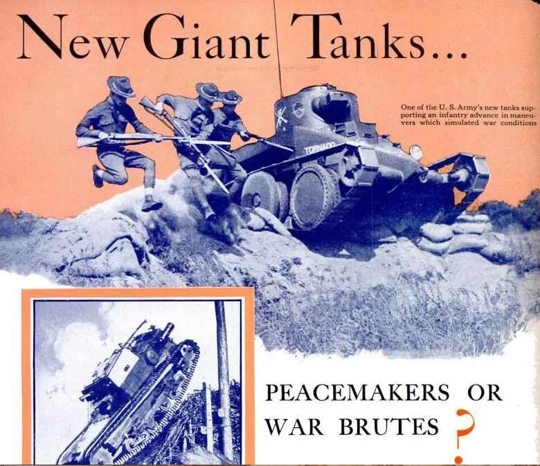 戦車は軍事評論家の想像力を掻き立てるほどの力を持っていたため、彼らはそのような恐ろしい兵器が戦争そのものを時代遅れにするかもしれないと想像したほどだった。1935年の当誌の記事「新たな巨大戦車:平和の使者か、それとも戦争の野蛮人か?」より