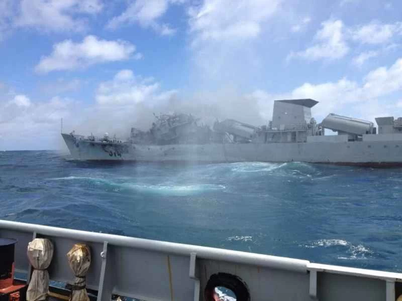 写真から、鎮江はまだ浮いているものの、現実の状況では相当な被害を被ったであろう艦橋が対艦ミサイルの衝撃で完全に崩壊していることがわかります。激しい煙、焦げ跡、激しい火災を示唆する炎が見られないことから判断すると、対艦ミサイルは実弾を搭載しておらず、艦の損傷はミサイルの質量による運動エネルギーによるものと考えられます。ミサイルの推進剤が燃えていないことから、鎮江は遠距離から被弾し、ミサイルの推進剤がほぼ使い果たされていたと考えられます。